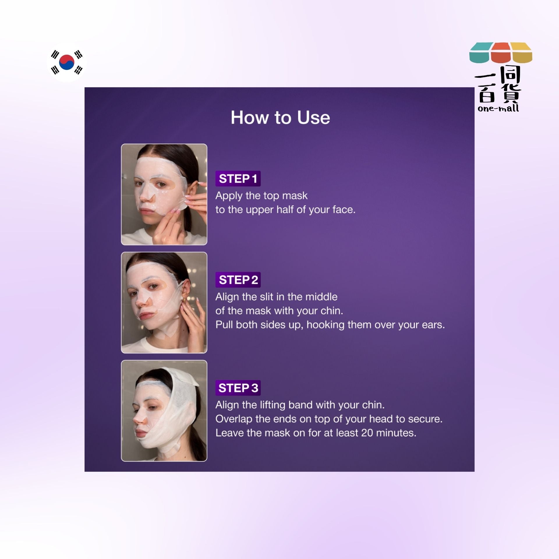 - 配有布製固定帶 完美包覆臉部線條 👐- 以NAD+配方打造 此全臉面膜結合高貼合度貼布 幫助維持肌膚緊緻感 潔淨臉部後 先將面膜覆蓋臉部 再視需求使用附帶的提拉繃帶 若出現長時間刺激 建議停用 One Mall 特別提醒將整組商品放在不過熱的空間 維持精華成分穩定 🤔