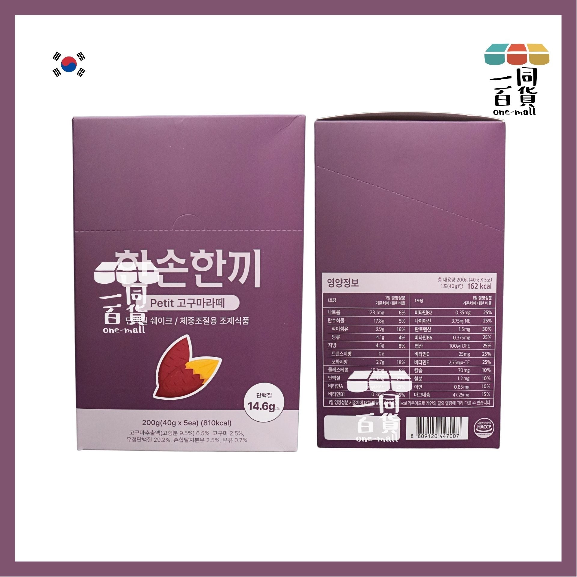 此韓國地瓜奶昔深受大眾青睞 只需搭配水或牛奶沖泡即可成為高飽足飲品 倘若飲用後感到不適 請酌情減量 One Mall 建議將每小包直立放置於廚房櫃中 保持新鮮度 🧢